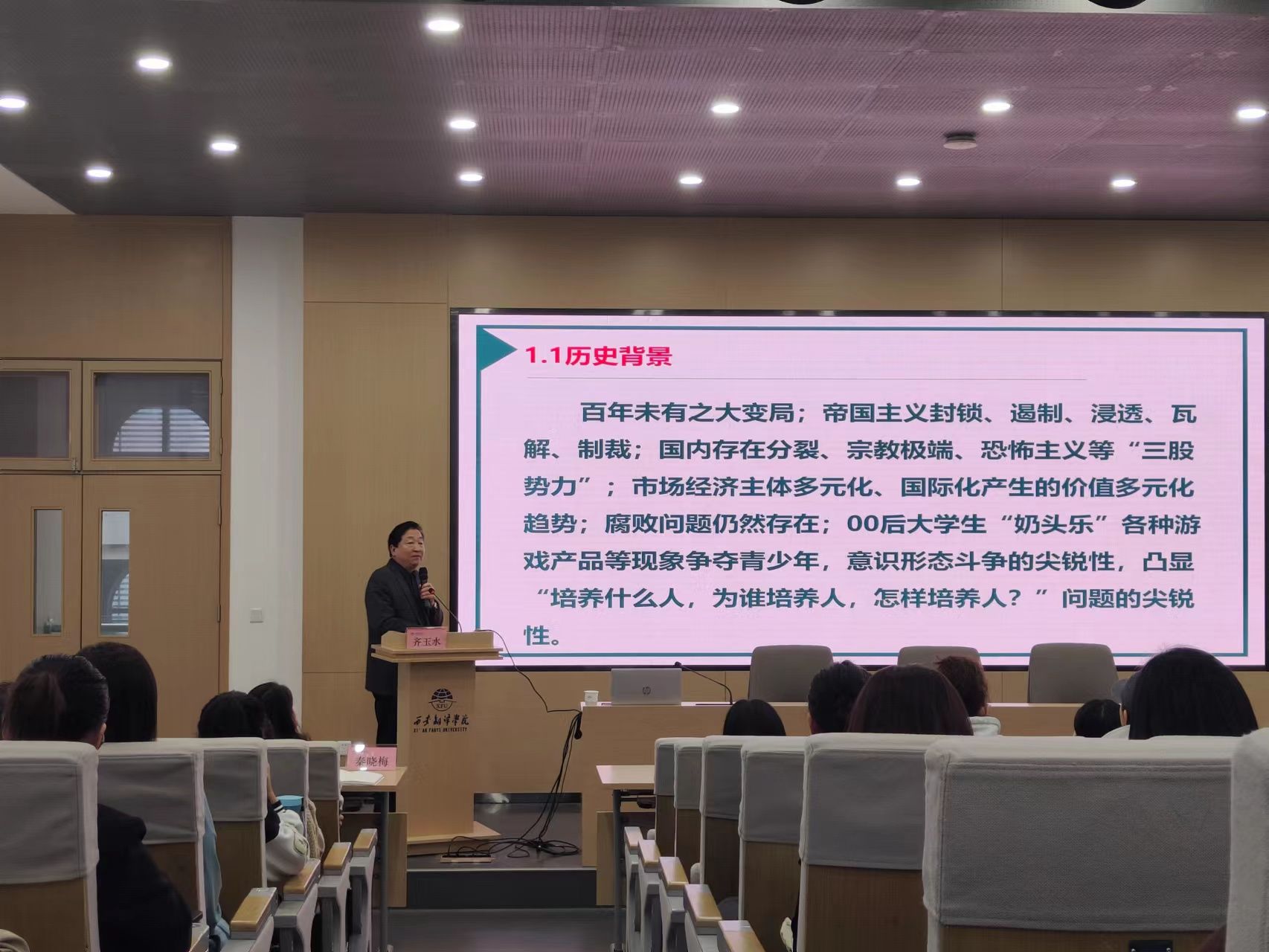 1018日下午,由西安翻译学院教务处和西安翻译学院教师发展中心主办的“2023年教师教学能力提升系列活动(第九期)”在923T学术报告厅举行。本期活动特邀请西安翻译学院副校长齐玉水教授,作主题为“课程思政专题”的讲座。