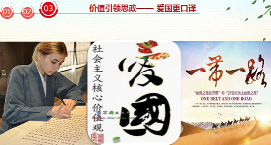 西安翻译学院紧紧围绕立德树人根本任务,充分发挥广大教师课程育人的主体作用,大力推动以“课程思政”为目标的课程教学改革。各学科挖掘课程所蕴含的思想政治教育元素和所承载的思想政治教育功能,并融入教学中的各个环节,实现思想政治教育与专业教育的协同推进和知识传授、能力培养与价值引领的有机统一,构建全员、全过程、全方位育人的大思政工作格局,培养合格的社会主义建设者和接班人。