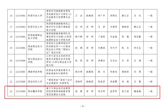 202234日陕西省高等继续教育学会下发《关于公布 2021 年度陕西高等继续教育教育教学改革研究项目立项结果的通知》,我校亚欧语言文化学院杨景老师申报的《基于外语在线开放课程的陕西高等继续教育课程思政建设与实践》成功获批一般项目